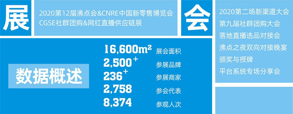 2020年第二屆新渠道大會、第九屆社群團購大會、第12屆沸點會CNRE新零售博覽會于8月8日-9日在杭州國際博覽中心召開,來自全國范圍的品牌方、供應鏈、平臺、新渠道創業者齊聚杭州,萬人匯聚共同探討新渠道,新機遇,新增長。